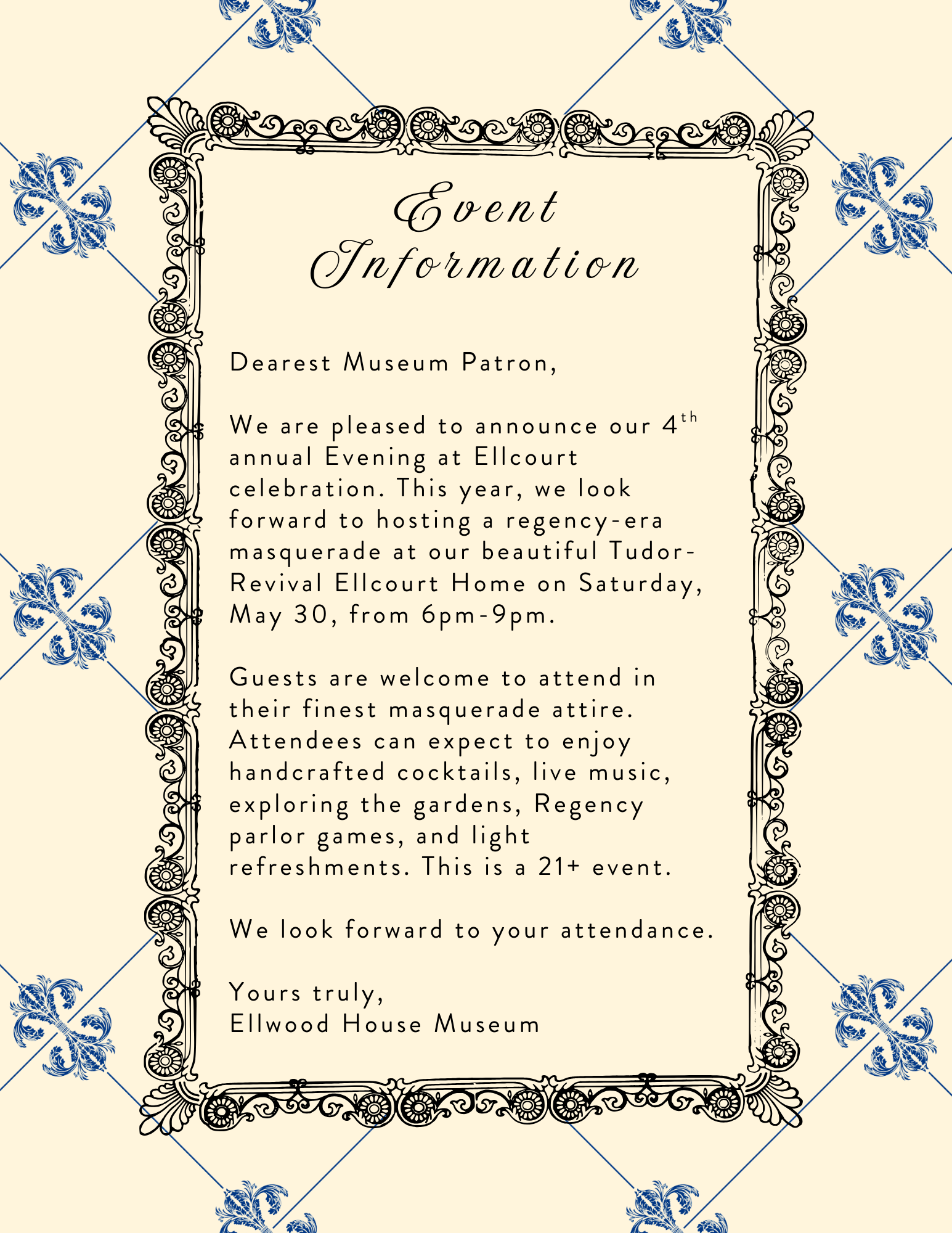 We are pleased to announce our 4th annual Evening at Ellcourt celebration. This year, we look forward to hosting a regency-era masquerade at our beautiful Tudor-Revival Ellcourt Home on Saturday, May 30, from 6pm-9pm.